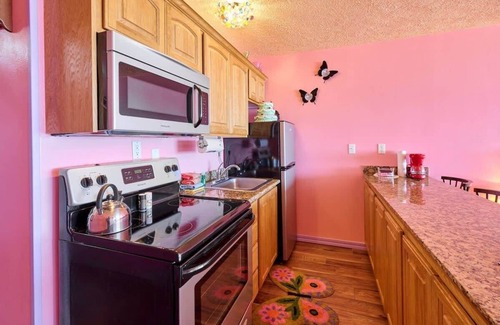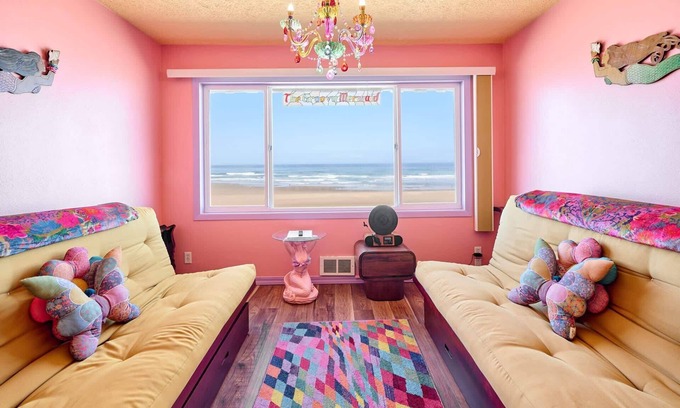 As you enter, you're greeted by a kaleidoscope of colors and a vibe straight out of a beach party. The king bed calls to you with its siren song, beckoning you to sink into its depths after a day of soaking up the sun, while two futons stand ready to accommodate your squad's slumber party dreams.