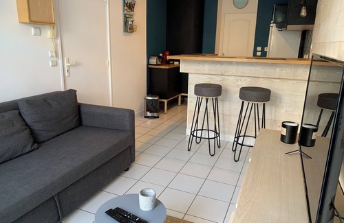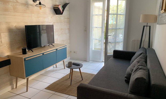 Crossing 2 room apartment, 32 m2 on the ground floor of a small condominium with a private terrace of 16 M² located in the heart of town, close to all amenities (trade, market, bus), 5 minutes walk from the train station and 20 meters from the beach.