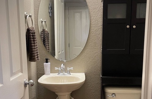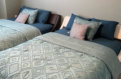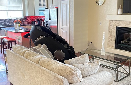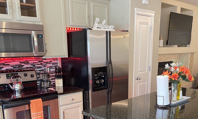 Relax with the whole family at this peaceful home that sleeps up to 12 guests. You’ll enjoy the open floor plan with front and back patios. Come see the cute unique features such as the detached garage, and fun low bed frames all while enjoying the kitchen hue lights. 3 bedrooms all upstairs with 4 queen size beds total and 2 queen pull out couches in the living room. Only 25min away from the airport and less than 5 minutes away from the grocery store!