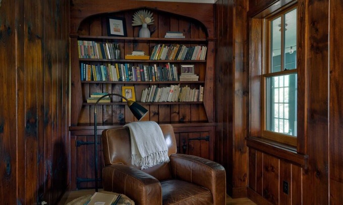 The living room features a pellet stove, and comfy seating on a light tweed sofa and two seafoam tuffet armchairs. In striking contrast to the light filled living room, a dark walnut library nook dares you to resist pouring a whisky and sinking into a good book.