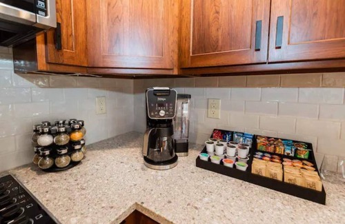 * **Kitchen & Dining:*** You'll find all the basic kitchen essentials you need, along with a coffee maker/K-cup combo, creamer, and sugar. The dining table seats 8, and there's an additional card table for 4.