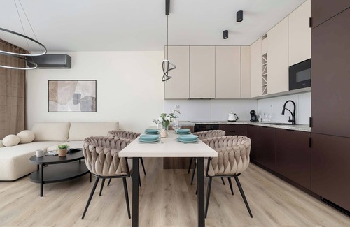 This spacious, luxurious apartment is ideal for families and groups of friends looking to spend an unforgettable time in the heart of Kraków. Designed to accommodate up to eight people, the stylish space offers three separate bedrooms, two elegant bathrooms and a spacious living room with kitchenette, creating the perfect environment for relaxing and spending time together. The living room is the focal point for gatherings and evening relaxation, thanks to a comfortable sofa and a large Smart TV with Internet-only access without television channels. A modern kitchenette equipped with high-end appliances such as an induction cooktop, oven, dishwasher and capsule coffee machine allows you to prepare gourmet meals. The apartment has three bedrooms, each designed for maximum comfort and privacy. Two bedrooms have comfortable double beds, while the third has a sofa bed. Two elegant bathrooms, equipped with a bathtub and shower, as well as hairdryers, are designed to offer comfortable conditions for refreshing oneself after an eventful day. Each room of the unit has access to a large balcony, where you can enjoy your morning coffee with a view of the neighborhood. Air conditioning in the living room provides a pleasant coolness on hot days. The apartment was designed with attention to every detail, which can be seen in the carefully selected furniture and accessories. Bright colors dominate, which optically enlarge the space, and elegant lighting creates a cozy atmosphere. Guests also have at their disposal such amenities as a washing machine, which significantly increases the comfort of their stay.