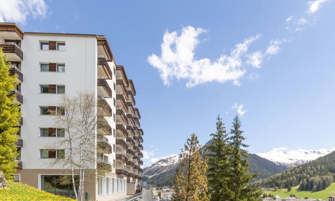 Davos: Apartment block "Guardaval (Utoring)". In the resort, in a central, quiet, sunny position on a slope, 1 km from the lake, 300 m from the skiing area. For shared use: indoor pool. In the house: reception, lounge with TV, WiFi, sauna (extra). Playroom, lift, storage room for skis, central heating system, washing machine (for shared use). Bread roll service and beverage service. Narrow motor access to the house. Roofed, parking (limited number of spaces, extra), communal covered parking (extra). Shop 300 m, restaurant 300 m, bus stop, railway station "Davos Dorf" 400 m, indoor swimming pool 1 km, bathing lake 1 km. Mountain railway, skisport facilities, slopes, ski school, sled run 1.5 km, cross country ski track, ice rink 300 m. Well-known ski regions can easily be reached: Parsenn 300 m, Jakobshorn 1.5 km. The building is located upstream of the resort of Parsenn mountain and offers beautiful view. Parking + garage (reservation on arrival).