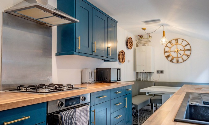 The kitchen area comes well equipped with utensils and cooking basics. There is a fridge/freezer, oven, microwave, kettle and toaster. There is a dining table next to the kitchen with bench style seating.