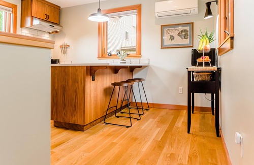 Quiet 2 story guest house for long-term rental. Great for remote work. Just steps away from NW 21st, NW 23rd, great restaurants, shopping, public transit, and Good Samaritan Hospital. Can walk to Forest Park, Chinese Garden, Japanese Garden, Rose Garden, Washington Park and the Pearl District. The main floor has a living room with a TV and work/dining table. Sunny upper level has a full kitchen, bath and sleeping area. The guesthouse is secured behind a locked gate. The street is generally pretty quiet. We unfortunately do not have guest parking, but there is plenty of on-street parking. On-street parking fees exist Monday-Saturday, 9am-7pm. No fees on Sundays or between 7pm-9am.