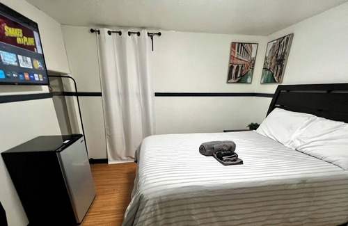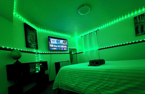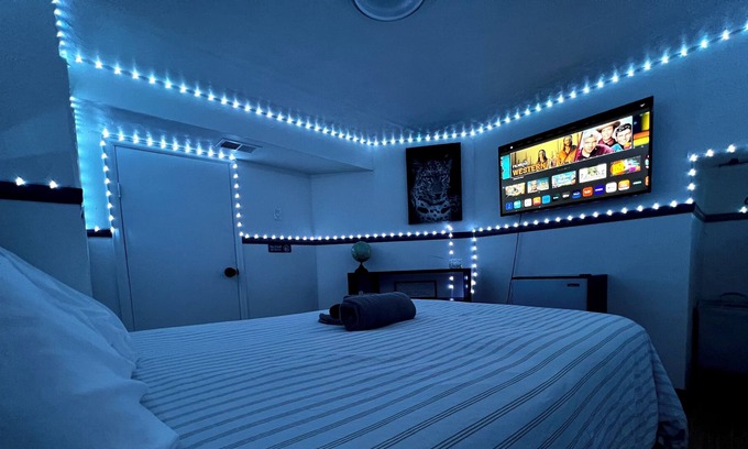 one bedroom 1 queen bed, phone chargers and 55-inch Tv with smart back lights, one kitchen with microwave and kitchen utensils, refrigerator and coffee maker. one restroom and living room with fold out couch bed, 65 inches tv with smart back lights and Samsung surround sound system, board games like chess, loteria and dominos.