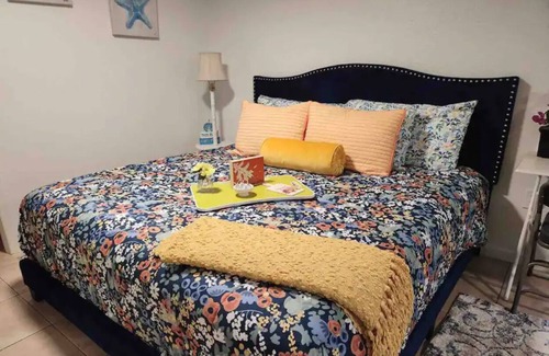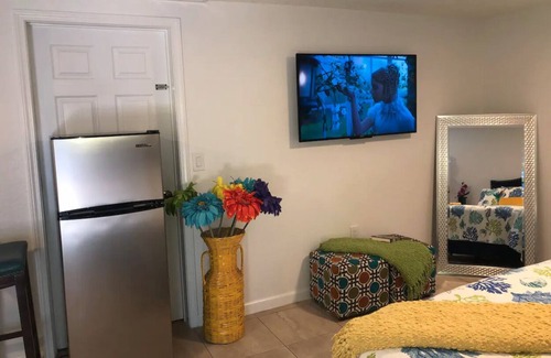Enjoy your stay at this vivid private space! This suite is a colorful paradise that is surrounded by nature on a 2 acre property. Guests will be surrounded by color and outdoorsy scenery. The designated parking area is to right, where you will find white rock and nicely at a colored bee post. As you walk up the steps that lead you to the patio, you will see the door that will lead you to your lively suite. Please be aware after 2 guest we charge $20.00 . , per guest per night and the guest suite is closed off from the main home. It is a room with private entrance, parking, and bathroom, Guest entrance is throught the patio with faux grass . Please note we have another listing Retreat Mobile Camper at the back of the house and Nature Cozy Home attached to Guest Suite on the same property, with Everything Private