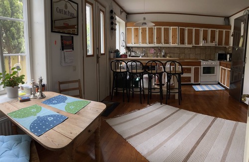 Old fashion streethouse in a pitoresque neighborhood. Fully equipped kitchen, a dining room and two living rooms that is shared with other guests. The garden is a perfect hide out from the busy city life and a georgius place to hang out and to relax. The Guesthouse is near to many different restaurants and bus and train stations is very near by.