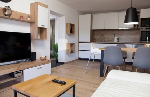Surround yourself with style in this standout space. This modern 4 star villa is situated on a peaceful hill above Terme Tuhelj and has an outstanding view of the surroundings. Apartment is located on ground floor and has everything You need for a perfect vacation and more. Fully equipped kitchen with oven, dishwasher and microwave with all the accessories. TV with 100+ programs and Netflix. Outdoor terrace with a wooden pergola, barbecue and a beautiful view will get You relaxed every time...