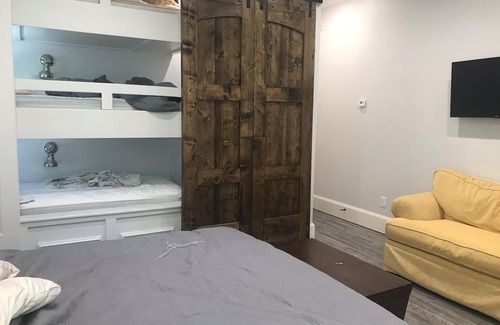 This property boasts a king size bed with triple stacked bunk beds to sleep comfortably 5 people! The facility is complete with a luxurious full bath with 10’ ceilings throughout! At your fingertips, you have a out door lounge complete with full size refrigerator with kitchen sink and smoker. While at your stay you have the ability to take advantage of the pool with spa and your very own place to set a fire in the woods making it to perfect way to finish off your day of fun and adventure! The weight room gives you a place to clear your head and get that reset you needed as well!