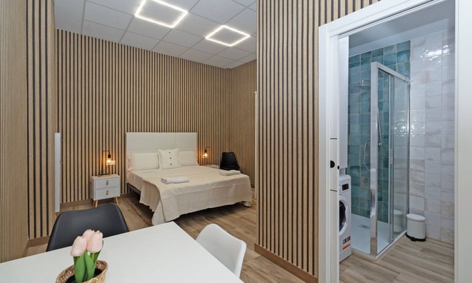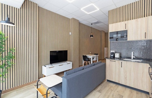 This apartment is designed with an open-plan layout. The living room features a comfortable sofa bed, a smart TV, and a dining table.