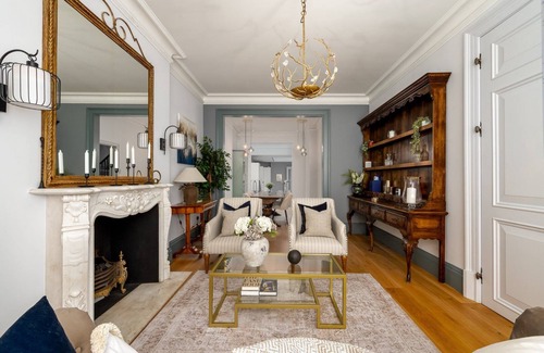 Step into a living space where elegance meets comfort. The stunning living room, with its high ceilings, intricate crown moulding and soft blue walls, exudes classic charm. Relax by the fireplace, sink into plush sofas or enjoy the warm natural light streaming through the tall windows.