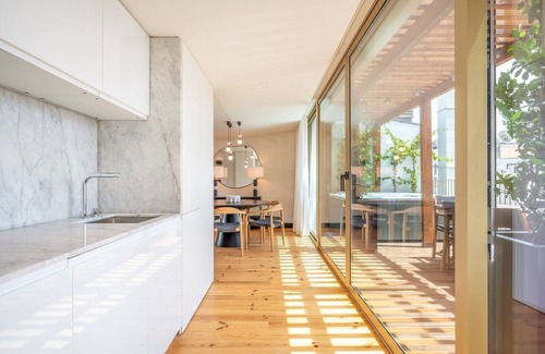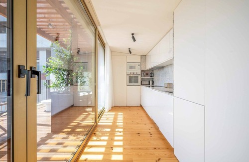 The unit has two large fully equipped terraces on the seventh floor. It has amazing views to Castelo De Sao Jorge. Step out onto the terrace to find a seating area and a luxurious jacuzzi, perfect for unwinding after a day of exploring the vibrant city. The kitchen is fully equipped with all the essential cookware and cutlery, including a stove, oven, and microwave, allowing you to prepare delicious meals effortlessly.”
