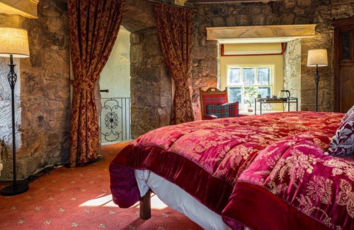 On the upper floor, there's a large bedroom containing an emperor-sized bed beneath a dramatic overhead oculus inscribed with Latin text and a further log fire. There's a full bathroom on the upper floor with a power shower.