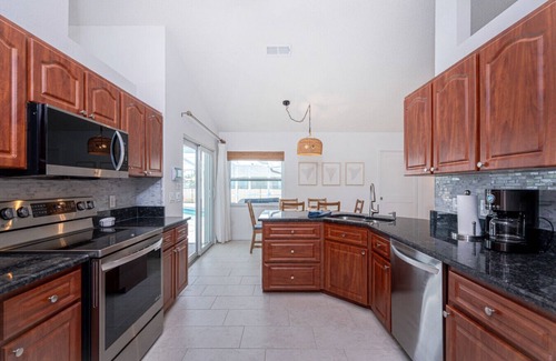 Unwind in your private heated pool or enjoy evenings grilling on the screened lanai. The fully stocked kitchen, open dining areas, and spacious living room make it easy to gather and share meals. With Wi-Fi, Smart TV with Roku, washer/dryer, and thoughtful touches throughout, you’ll have everything you need for a comfortable stay.