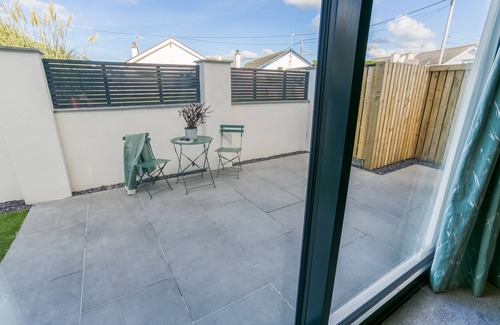 Enclosed, sheltered gravelled and stone-flagged patio areas with outside dining furniture for six.