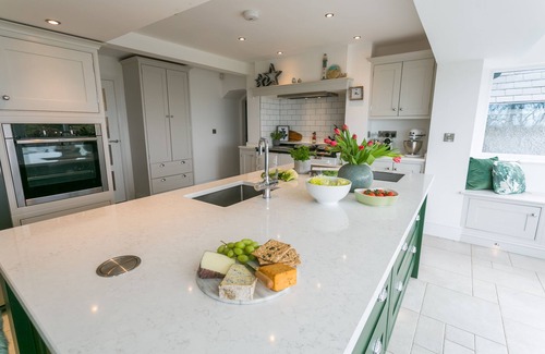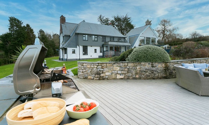 Pour a long lazy drink while the children tumble about on the lawn or splash in the pool. The hot tub is great for a soak at dusk and the terrace with sea views is a yoga stretch from the house. Gather around in the shade of the trees with blankets at the fire pit -a great spot for a night cap under the stars, Inside the spacious kitchen has everything you need to cook for a full house and those views follow you everywhere! Fling open the patio doors and soak up the sea - the Aga will share the load and the chef will love the induction hob on the work island and space to chop the salad. Outside are several places to eat.