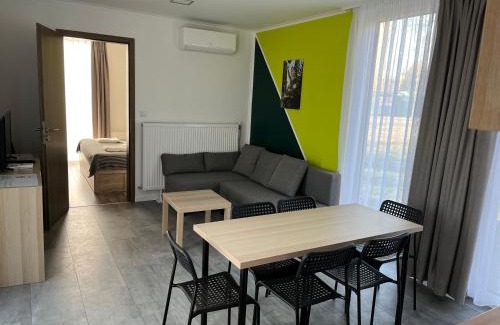 Hód-Thermal Camping is a recently renovated chalet in Hódmezővásárhely where guests can make the most of its open-air bath and garden. The air-conditioned accommodations are 16 miles from Votive Church Szeged, and guests can benefit from private parking available on site and free Wifi. The chalet offers an outdoor swimming pool with a water slide, as well as a sauna and a shared kitchen. The chalet provides guests with a terrace, pool views, a seating area, a flat-screen TV, a fully equipped kitchenette with a microwave and a toaster, and a private bathroom with shower. A fridge, a stovetop, and kitchenware are also offered, as well as a coffee machine and a kettle. At the chalet complex, units are fitted with bed linen and towels. A mini-market is available at the chalet. For guests with children, Hód-Thermal Camping provides a children's playground. The chalet also features outdoor fireplace and a picnic area for a day outdoors. Szeged National Theater is 15 miles from the accommodation, while New Synagogue is 16 miles from the property.