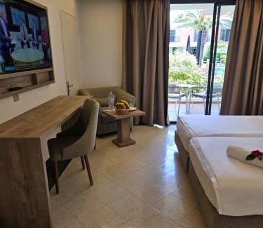 BathroomBidet, Bathtub or shower, Body soap, Free toiletries, Hairdryer, Towels, Bathtub, Toilet paper, Toilet, Private bathroom, ShampooMedia & TechnologyFlat-screen TV, Telephone, TVGeneralHeating, Air conditioningOutdoorsTerrace, BalconyViewView, Pool viewServicesWake-up serviceBedroomWardrobe or closetAccessibilityEntire unit wheelchair accessible, Adapted bathCleanliness & disinfectionHand sanitizer |
