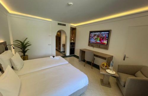 BathroomBidet, Bathtub or shower, Body soap, Free toiletries, Hairdryer, Towels, Bathtub, Toilet paper, Toilet, Private bathroom, ShampooMedia & TechnologyFlat-screen TV, Telephone, TVGeneralHeating, Air conditioningViewView, Pool viewServicesWake-up serviceBedroomWardrobe or closetAccessibilityAdapted bathCleanliness & disinfectionHand sanitizer |