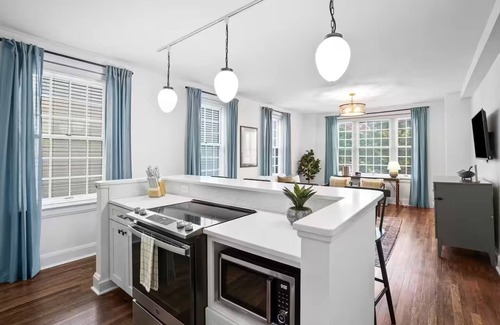 The kitchen is equipped with stainless-steel cooking appliances, basic cookware, quartz countertops, and seating for casual dining. Additionally, there is a small coffee station to kickstart your mornings.