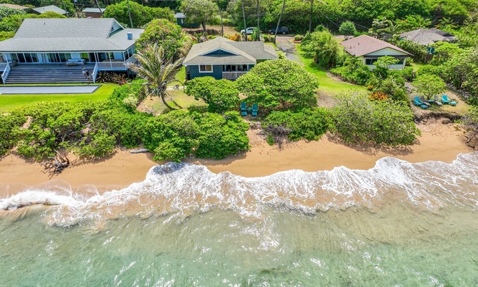 This lovely 1,400 square ft. Kaua`i vacation rental beach cottage has 3 bedrooms and 2.5 bath all on a beautiful sandy beach.