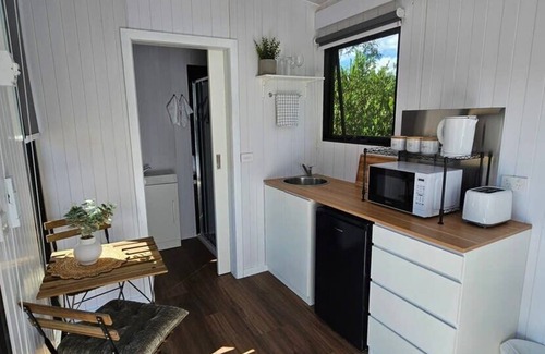 A cozy 139-square-foot tiny home with easy access to water, split-air conditioning, a kitchenette, cooking equipment, and excellent bathroom facilities. These amenities include an eco-friendly cassette toilet with a removable waste holding tank, hand basin, and gas-heated shower—making it a perfect choice among relaxing holiday homes.