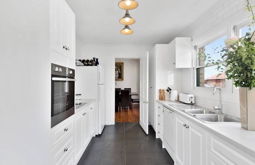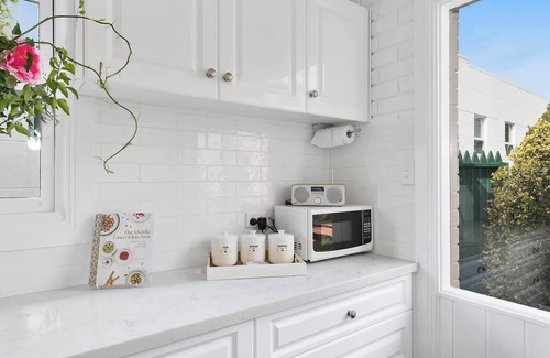 Hampden Manor evokes the same old-world charm as its location—Battery Point. A grand entrance highlights an elegant arched doorway, intricate crown moulding and timeless decor, welcoming you inside. Two living areas offer ample space to come together or spread out, with TVs and leather lounges in both. Original period features and tasteful collectibles throughout add to the property’s allure. Cook meals in the bright, white kitchen with ample bench space and all the essentials. A formal dining area seats 10 for meals at home, while a private courtyard is equipped with a BBQ and space to dine alfresco.