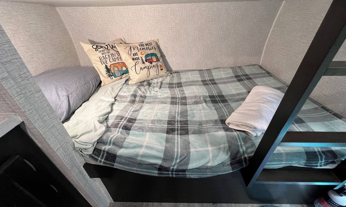 Our Happy Glamper isn’t just a place to sleep—it’s a cozy, memory-making experience designed for comfort, fun, and connection. What makes our RV unique is the perfect balance of modern convenience and outdoor charm. Inside, you'll find a comfy queen bed, twin bunks, and soft linens to ensure a restful night’s sleep. The fully stocked kitchen includes cookware, dishes, a microwave, fridge, and coffee machine—because great mornings start with a fresh brew! There’s also air conditioning and heating, so you’ll stay comfortable in any season. We provide family-friendly games and special touches like cozy lighting and cute, themed decor to make the space feel like home. Step outside to enjoy your private outdoor seating area with a grill, firepit and outdoor games—perfect for BBQ dinners or roasting marshmallows under the stars. It’s an ideal spot to unwind after a day of adventure or relax with a glass of wine. Our RV is located in a peaceful campground with access to amazing resort-style amenities, including: Two heated swimming pools A lake for fishing or paddle boating Arcade & game room Basketball, tennis & volleyball courts Walking trails and picnic areas We’re always happy to share local tips on nearby hikes, wineries, family-friendly activities, and restaurants to help you make the most of your stay.