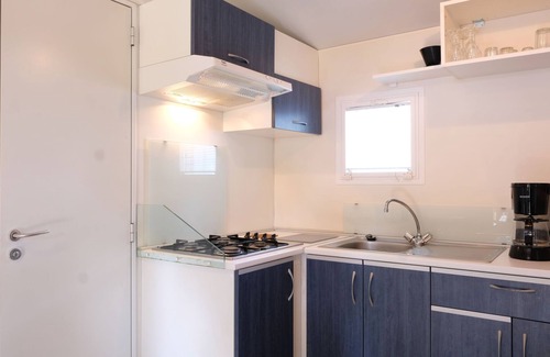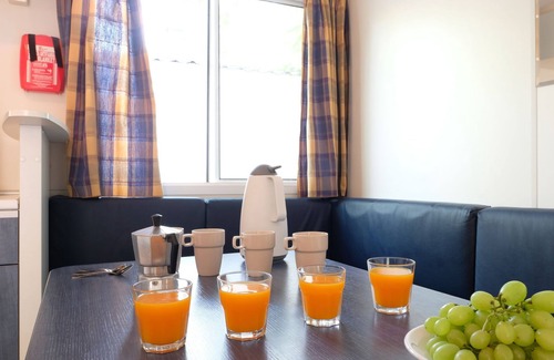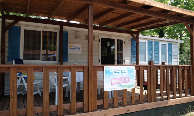 "Happy Plus", 4-room mobile home 32 m2. Comfortable furnishings: living/dining room with electric heating and air conditioning. 1 room with 1 french bed (140 cm, length 190 cm). 2 rooms, each room with 2 beds (70 cm, length 190 cm). Open kitchen (4 hot plates, microwave, freezer, electric coffee machine). Shower, sep. WC. Terrace partly roofed. Terrace furniture, electric barbecue (portable), deck chairs (2). Facilities: mosquito net. Parking (1 car). Please note: non-smokers only. Maximum 1 small pet/ dog allowed. IT029040B14KOQCKTE