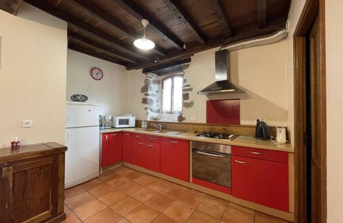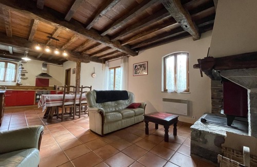 Independent gîte in an old sheepfold located near a farm (meadows, sheep, cows) offering a lovely view of the mountains. Ground floor: fitted kitchen area (microwave, fridge-freezer, gas hob, electric oven, dishwasher). Living room, lounge area (fireplace/wood stove, TV). WC. Cellar (washing machine). Upstairs: 2 bedrooms (1 double bed, 2 single beds). Bathroom. WC. Linens provided. Electric heating in supplement. Wood included. Terrace, garden furniture, barbecue, enclosed garden. Deckchairs. Possibility of visiting the owners' farm on site: sheep, cattle... Hikes from the cottage. Only one animal accepted.