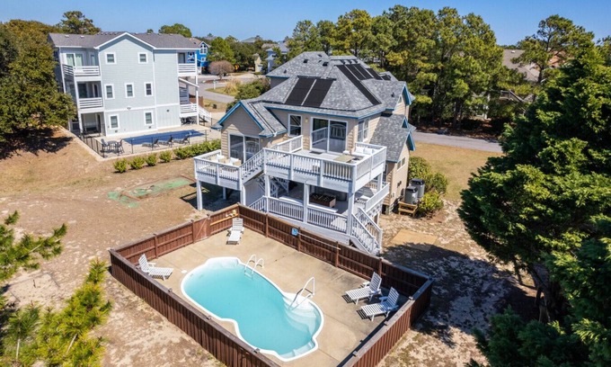 Harbor View is a spacious 3-story , 4-bedroom, 3-bathroom getaway in Corolla, offering 2,368 sqft of comfort & charm. With a private fenced pool, hot tub, fire pit, & BBQ, it’s the perfect spot for families or groups to unwind. Inside, enjoy a fully stocked kitchen, smart TVs, cozy fireplace & fun games for all ages. Kid-friendly amenities make traveling with little ones a breeze. Just minutes from the beach, this beautifully upgraded home blends laid-back luxury with the best of the Outer Banks