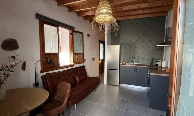 The Haría apartment in Tabayesco offers 30 m² of space and accommodates up to 4 people. You have 1 bedroom and a living room with a 135 cm sofa bed, as well as 1 bathroom, which is accessed by going down 3 steps. The apartment is located next to the pool, which you can access directly from the bedroom. Your private, fully equipped kitchen includes a fridge, coffee maker, kettle, toaster, and stovetop. Amenities include Wi-Fi suitable for video calls, TV, and beach towels. During your stay, you can enjoy mountain views.