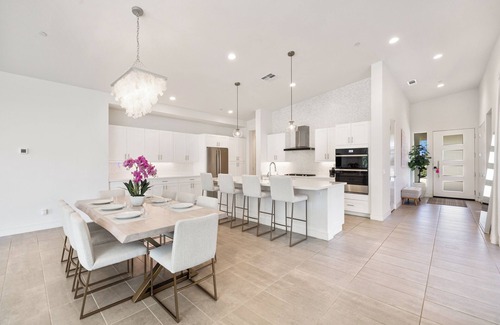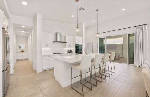 Inside, the home has an open-concept layout and seamless indoor-outdoor flow. The great room invites relaxation with comfortable seating, a smart TV, and walls of sliders that open directly to the pool deck. The sleek kitchen is outfitted with stainless steel appliances, quartz countertops, and a spacious island with bar seating for four. Adjacent, the dining area seats eight and sets the stage for memorable meals.