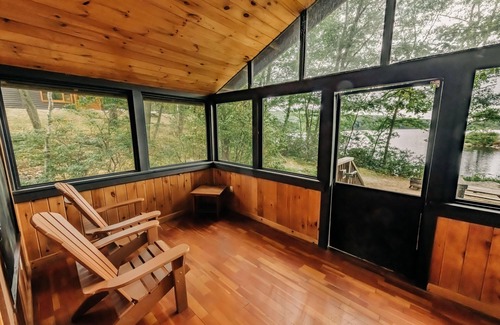 This 7-room cabin holds up to 12 people. A large common room with a table, chairs, and sofas greet you upon entry. Off one side of the common room are three bedrooms each with a pair of bunkbeds. Pillows with clean pillow cases and wool blankets are provided but bed linens are not provided. On the other side of the cabin is the kitchen and a pair of bathrooms each with their own shower. Off the back of the building is a screened in porch overlooking the lake.
