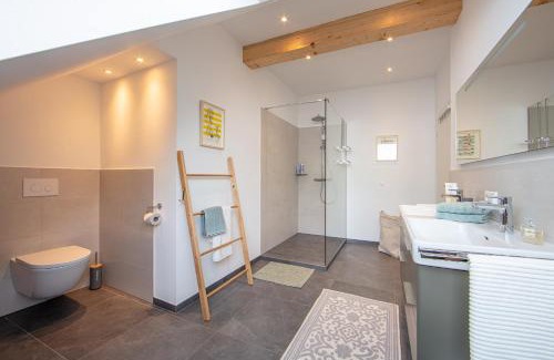 Haus am Rebberg in Öhningen offers a spacious apartment with two bedrooms and two bathrooms. The living room includes a sofa bed and a dining area, providing ample space for relaxation and meals.Modern Amenities