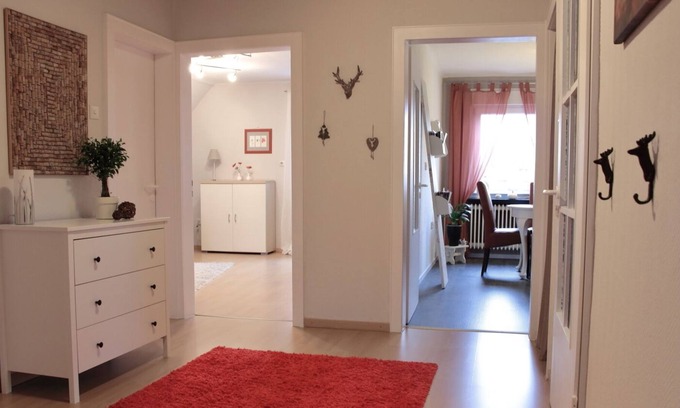 The lovingly furnished, bright apartment is located on the first floor of our apartment building and offers an excellent starting point for extensive hiking tours on the very well signposted dream loops in the Saarland-Hunsrück hiking region. The central location of the apartment enables our guests to travel relatively short distances to attractive destinations. The gem city of Idar-Oberstein can be reached in 15 minutes by car. But a trip to the Moselle wine region, with its many castles and small, rustic wine towns, is also highly recommended and can be reached in 30 minutes. The oldest city in Germany, Trier, is 50 km away and definitely worth a trip. Hahn Airport is about a 20-minute drive from our house. The equipment of the apartment includes: a flat screen, free WiFi, a new, well-equipped kitchen with dishwasher, microwave, toaster and coffee machine, information material on various hiking tours and tourist attractions. You can also use the large garden with a barbecue, outdoor seating and garden loungers. A washing machine and dryer can be used, after prior agreement.