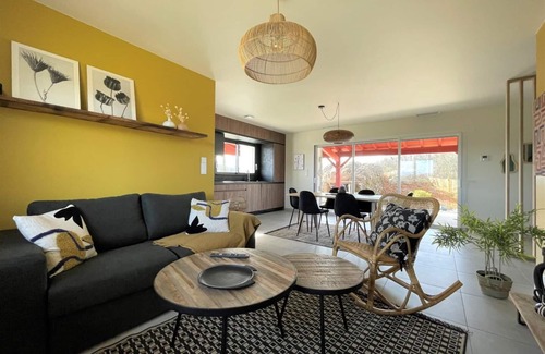 Old border completely renovated into a comfortable and modern gîte, facing the mountains of the Basque Country, near Saint-Jean-Pied-de-Port and its entertainment (6 km). Gîte on one level, opening onto a covered south-facing terrace offering an unobstructed view. Unenclosed land surrounded by meadows and sheep: your pet is welcome but will be supervised. Well-equipped kitchen (induction hob, oven and microwave, fridge-freezer, dishwasher). Adjoining storeroom (washing machine). Spacious and bright living room, lounge area (TV, Fiber internet box, books, games for children). 1 bedroom (1 double bed), shower room (Italian shower, washbasin) and adjoining dressing room. 1 bedroom (2 twin beds 90), adjoining shower room (Italian shower, washbasin). 1 WC. Beds made for your arrival. Bathroom and household linen included. Baby equipment on request (cot and chair). Aerothermal heating (reversible in air conditioning in summer), low loads to be expected (electric meter reading). 30 m2 terrace facing the mountains, garden furniture, sun loungers, gas griddle. Owner's house at the back of the gite. Many hiking trails nearby.