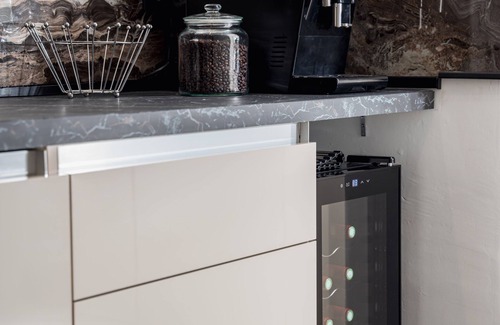 A modern kitchen equipped with oven, hob, microwave, fridge-freezer, washing machine, dishwasher, wine cellar, etc…