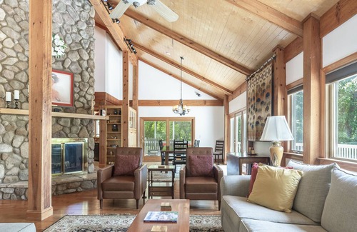 Havencrest offers spectacular views of the Blue Ridge Mountains, Lake Lure, and beyond that will leave you breathless. This mountaintop home in Gateway Mountain, a 3,000-acre nature preserve, is a wonderful getaway for family and friends yet close to all Western North Carolina attractions and activities. Stay on the mountain and enjoy all that Gateway Mountain has to offer, including 2 lakes, a beautiful waterfall park, hiking trails, and abundant wildlife. You are secluded yet just 10 minutes to I-40. You are also a short 30-minute drive to Asheville and the Biltmore House. This luxurious home truly has something for everyone! Inside, the gourmet kitchen on the main floor leads into a large family room/dining room combo with spectacular views and a large screened porch that connects to the expansive deck for optimum outdoor entertaining. Two of the 3 levels offer expansive views, and there are 2 primary suites, guest quarters, a pool table, a fire pit with seating, large decks, a gas grill, and floor-to-ceiling fireplaces on 2 levels! Aside from 5 bedrooms, this house has a queen Murphy bed, 3 queen sleeper sofas, and 2 sleeper chairs. Bring the family and start making memories here!