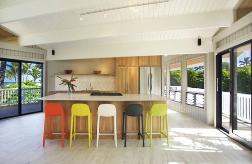 Surrounded for privacy by a lava rock wall, towering coconut palms, and lush landscaping, Ha'ena Kai’s elevated position, wall of windows, and wraparound lanai capture superlative views of the reef and fringing mountains. With the newly added split unit air-conditioning system in all rooms, you are sure to stay cool after a day of adventure! The home’s open architectural design creates an inviting gathering space while also allowing for breezy trade winds to cool the sanctuary naturally. Additional ceiling fans are strategically located throughout the structure to ensure your comfort yet retain that Old Hawaiian feel. Best of all, Haena Kai has recently undergone a dramatic and purposeful renovation to make your visit a respite of pure pleasure and renewal.