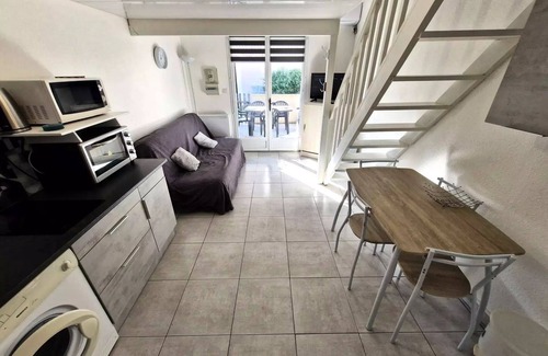 Accommodation: Comfortable mezzanine studio house with air conditioning and terraceMarine lake area - For 4 people - A mezzanine with a double bedand two single beds- Equipment: TV, ceramic glass plates, mini oven, microwave, refrigerator-freezer, washing machine, electric filter coffee machine,Senseo coffee maker, kettle, toaster, electric barbecue- Surface of 26 m2 with a terrace of 10 m2- West exhibition- Beach 800 m and centre 700 m- Marine lake at 50 m and shops at 350 m- Private parking with barrier