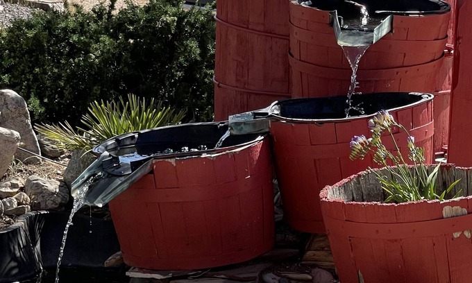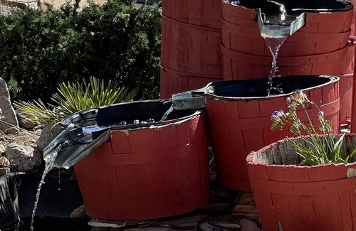 Cozy themed Hawaiian Cottage! Beautiful huge wooden fountain nearby. Come stay here and feel like you just stepped into the tropics! Back to nature. No running water. *Private Bath and shower NEARBY..