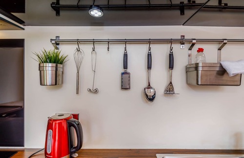The kitchen is equipped with a stovetop and a dishwasher, as well as an electric kettle, a microwave, and cookware. And because there's a washing machine, you can go a bit lighter on your packing. Other amenities include a BBQ grill, heating, and wardrobe or closet.