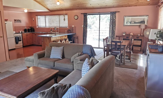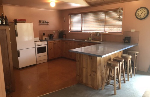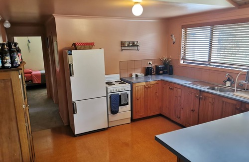 Our holiday home is a fully equipped house. The large open plan kitchen, dining, living area has a pine lined cathedral ceiling and a wood heater that can be used to warm the entire house. There are three bedrooms; one has a double bed, another has a queen size bed whilst the third bedroom has two bunk beds and a single bed. In total three singles and two double beds can sleep seven comfortably. Ideal for two small families. Please let us know which beds you intend to use and we will prepare them for you and supply towels and tea towels. All beds have quilts and pillows and extra blankets are stored in the bedroom drawers. We can also provide a portable cot. There is a large fully equipped kitchen, dining and living area. The new bathroom has a shower, toilet and hand basin. There is a second separate toilet. Upstairs is not accessible. The laundry has a washing machine, sink and our storage cupboards. The firewood is stacked near the water tank. I use my mobile to access the internet and can use it as a hotspot for my laptop. Free wifi is available in the Coles Bay village. Before guests leave, we do ask that you leave the shack in a clean, neat and tidy condition.