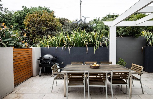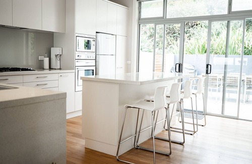* Large open plan well stocked kitchen with breakfast bar and 4 bench chairs. Kitchen has dishwasher, fridge/freezer, electric oven, gas stove, milkshake machine, kettle, toaster, electric mixer, sandwich maker, electric frypan, food processor. A northerly protected courtyard opens off the kitchen to an alfresco dining area with table & 8 chairs, 2 sun lounges and BBQ.