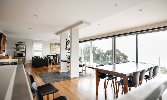 * The main dining area opens out to deck and enjoys fabulous views of the beach. Extension dining table has seating for 12 people.