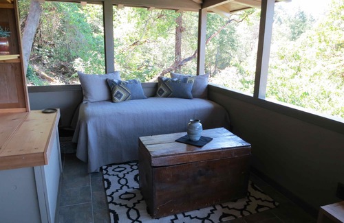 For all the charm & craft, you'll find that the layout makes sense. In the master suite is a Cal king bed, 'en suite' full bath and private patio. Upstairs in the guest bedroom are two extra long twins looking out into the forest, with a separate full bathroom on this main level. We also have two more regular twins available on the covered porch, as well as a convertible twin/full sofabed in the entry den. The kitchen opens onto the porch, looks out beyond the trees and is connected with the main living room.