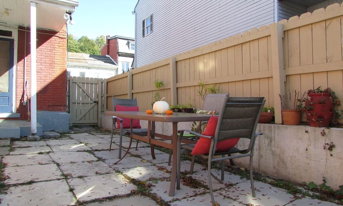 The stay includes a covered porch area and open air area with outdoor table and chairs. The yard is fully fenced-in for privacy and is a nice place to relax and lay out your plans on how to take over the world. This space is a shared space. Enjoy our small sampling of Hex signs, all painted by local artists, and a reflection of the local, Pennsylvania German culture that is at the heart of Hamburg.