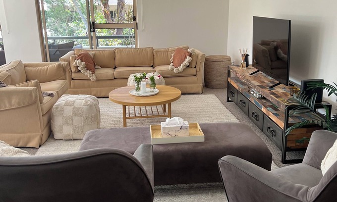 Quiet and secure in the Heart of Newport Village this spacious three bedroom property is sure to delight. Surrounded by an oasis of established gardens offering a sense of tranquility it is just metres to the popular shopping precinct, restaurants and Newport Beach. The property enjoys a triple aspect of north, east and west framed with a large wrap around garden terrace. Three bedrooms, with air conditioning or ceiling fans have a beautiful sunny garden outlook, and all come with luxury tempur beds and built in wardrobes. Third bedroom has access to the balcony. Open plan kitchen (with new stainless steel appliances), living and dining flow seamlessly to the sun soaked private terrace. Large family bathroom, internal laundry plus outdoor clothesline terrace. Auto single secure under cover garage. Direct undercover access to Barrenjoey Road shopping and dining precinct. Just metres to Newport Village, beach and city bus. With easy walking distance to the beach (4 min walk) and village (100m to Coles supermarket), this property is perfect for anyone looking for a relaxed, safe and stress free holiday.